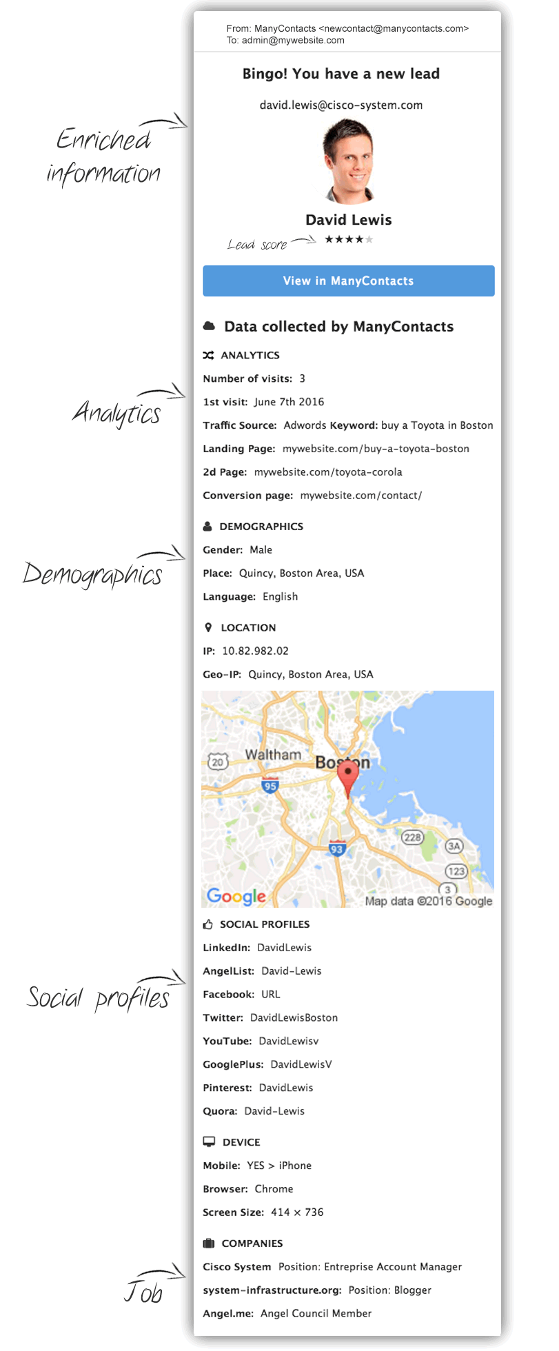 - As soon as an email address has been filled in your form, our magic script collects the email, even if the form is abandoned. Then our servers enrich information about your new lead. It also works on shopping cart, landing page, signup forms or live chat widgets. Your lead's information is sent by email.